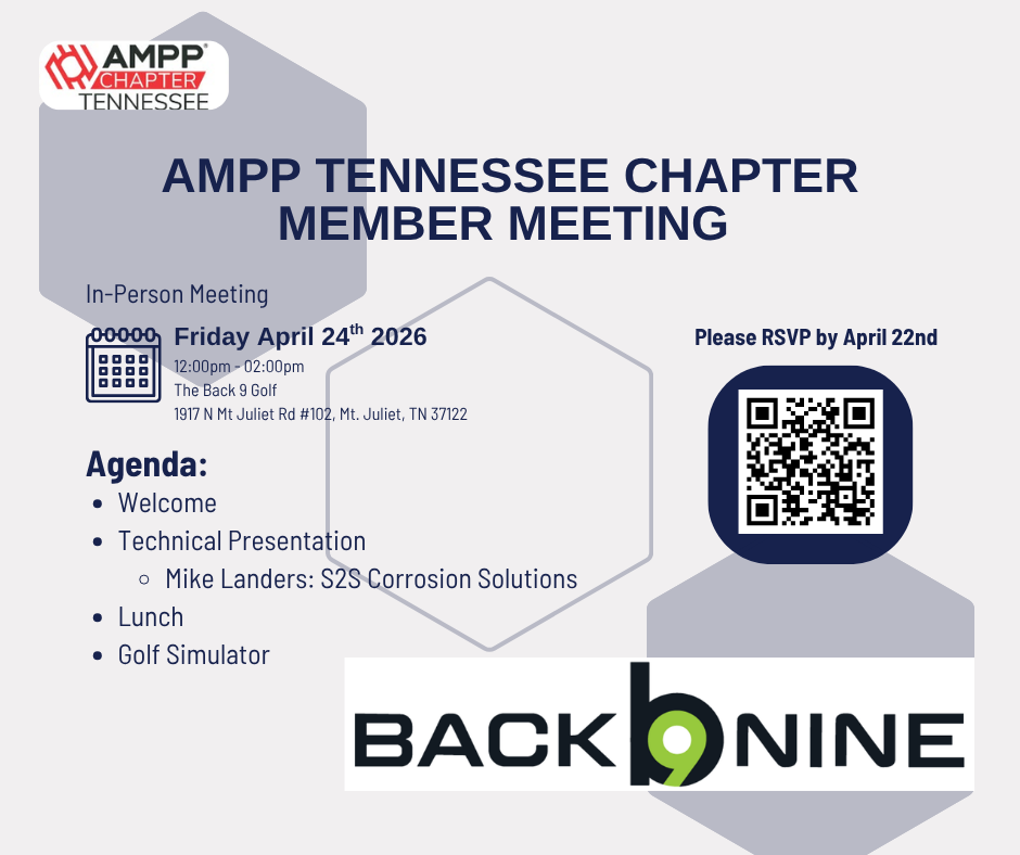 We’re excited to invite you to our upcoming Tennessee AMPP Chapter in‑person meeting, hosted at The Back 9 Golf Simulator in Mt. Juliet!